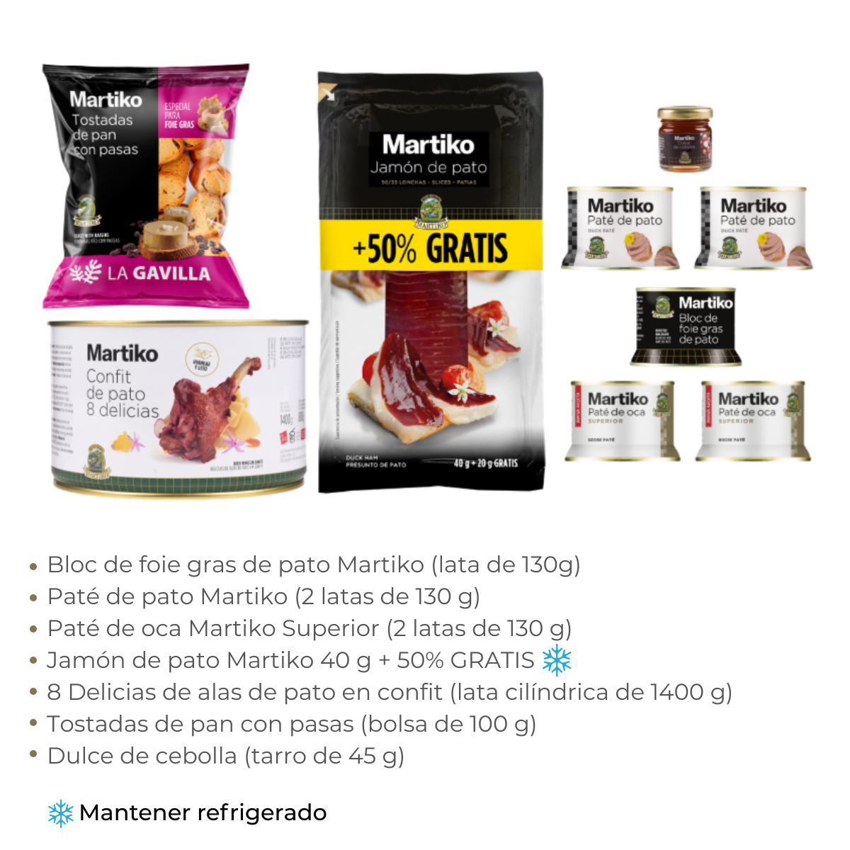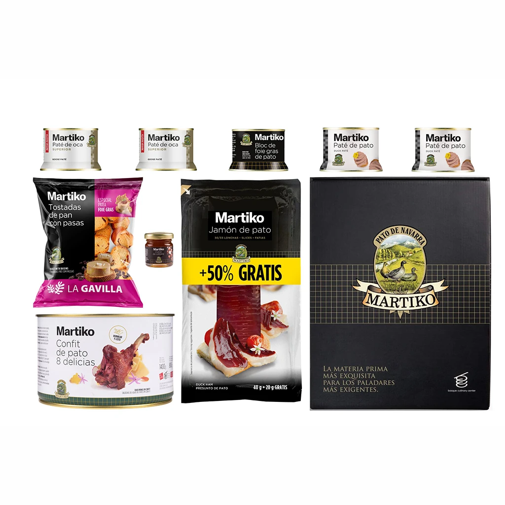 Este lote reúne una selección exquisita, para dos, de productos Martiko: bloc de foie gras, delicias de confit, jamón de pato, patés de pato y oca y sus acompañamientos perfectos (tostadas de pan con pasas y dulce de cebolla).