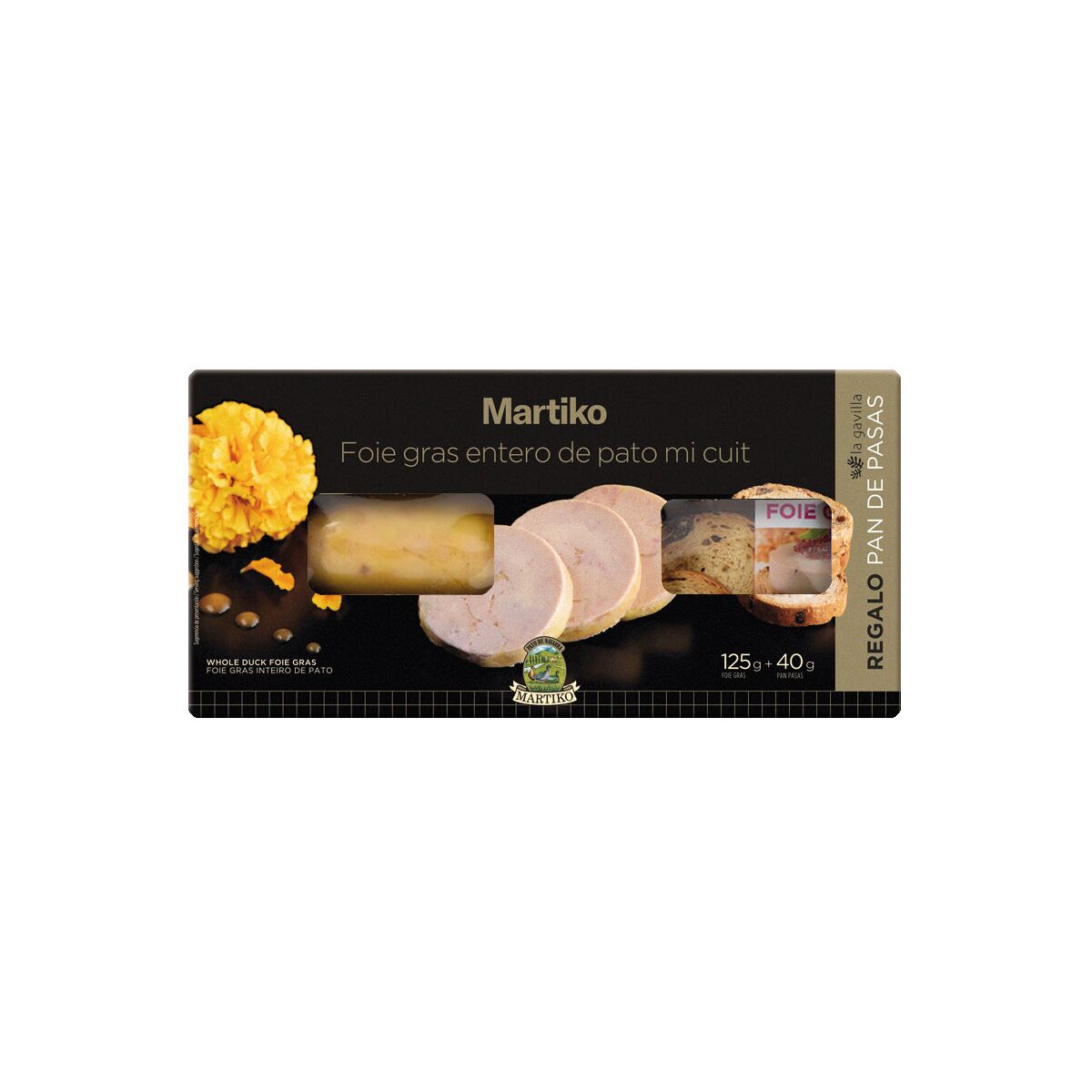 FOIE GRAS ENTERO DE PATO COCIDO.98% foie gras de pato, sal, azúcar, brandy, especias, antioxidante: E-301 y conservador: E-250. PAN TOSTADO CON PASAS. Harina de TRIGO (GLUTEN), agua, pasas (20%), levadura, azúcar, MANTEQUILLA (LECHE), (MANTEQUILLA (LECHE) de NATA (LECHE) pasterizada, fermentos lácticos y colorante: E160a(iii), sal, emulgente: E472e, antioxidante: E300 y enzimas. Puede contener trazas de SOJA y MOSTAZA.