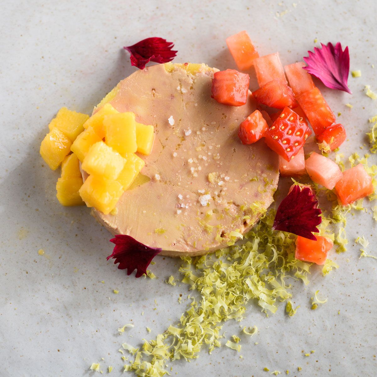 Foie gras entero de pato cocido + pan tostado con pasas.
