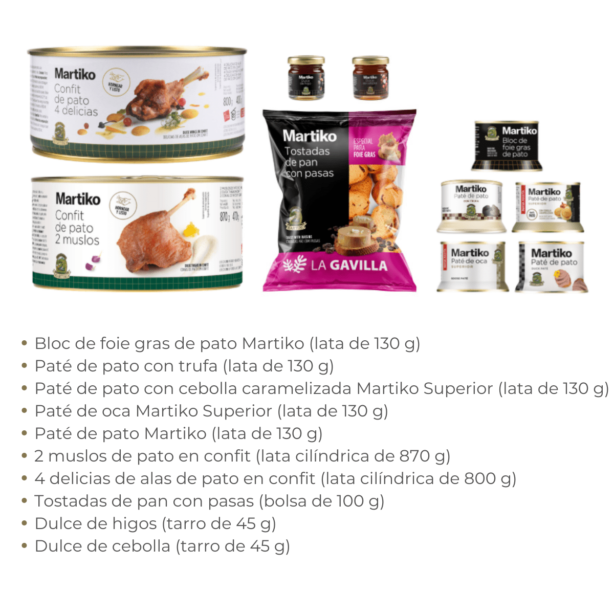 Para los auténticos amantes de Martiko hemos creado este lote gourmet que, sin duda, triunfará en cualquier mesa. Una cuidada selección de nuestros imprescindibles: bloc de foie gras de pato, paté de pato, paté de oca, paté de pato con trufa y con cebolla caramelizada, nuestro confit (en muslos y delicias) y, como toque final, unas tostadas de pan de pasas acompañadas de dulces de higo y cebolla.