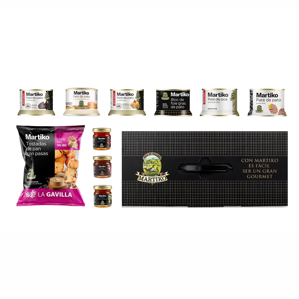 «Siempre hay pato Martiko en mi despensa» es un lote gourmet cuidadosamente seleccionado con nuestras mejores conservas: bloc de foie gras, paté de pato, paté de oca, patés de pato con diferentes sabores (trufa, dulce de calabaza y cebolla caramelizada), dulces de diferentes sabores, y pan tostado con pasas.